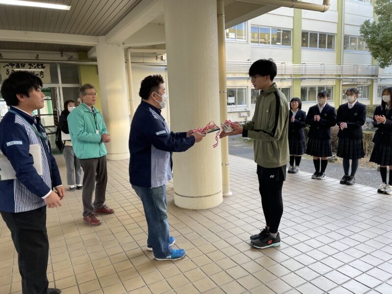 写真上:大津坂本七丁目店の並川店長さんより生徒会長へ記念品の贈呈