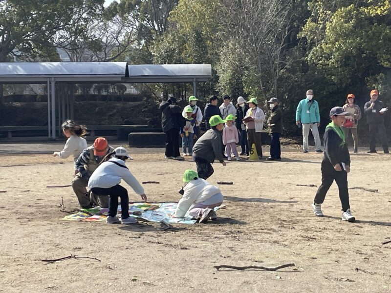 野外で「ネイチャーゲーム 動物ヒントリレー」