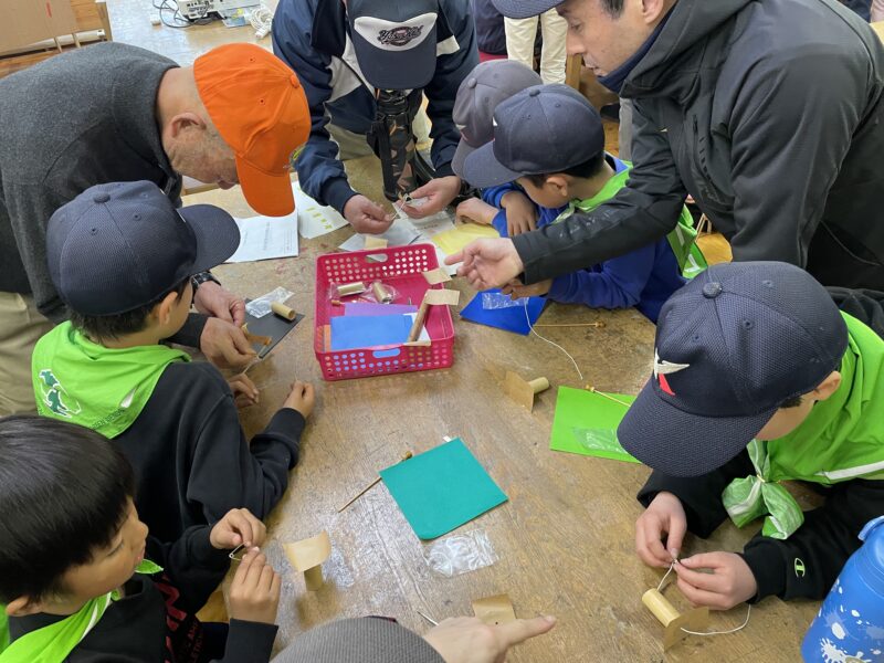 午前中は滋賀森林インストラクター会の皆さんの指導による野外での自然観察ビンゴ、ネイチャーゲームを楽しみました!班対抗でとっても盛り上がりました!午後は各団ごとにこの一年間の活動内容を発表して、「かえるゲコゲコ」を作成し交流を深めました!松ヤニとヒモを使って、カエルの鳴き声を出す仕掛けです。ヒモの調節が難しく、試行錯誤を繰り返しみんな真剣に作っていました!飾りにするカエルの折り紙は、大人でも少し難しいとのことでしたが、上手に折れた人が教え合うなどみんなで協力する姿も見られました。最後は団対抗、ゲコゲコ鳴き声対決も行い、竜王町緑の少年団さんの優勝で幕を閉じました!