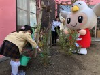 天候にも恵まれ、園児の皆さんが元気いっぱいの声で「はとっぴー」と呼ぶと、平和堂のイメージキャラクター「はとっぴー」が登場し、園児の皆さんは笑顔いっぱいの表情でした。そして、園庭にシンボルツリーとして県の木である「モミジ」を植樹しました。