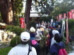 10月24日(水)に、県内各地から抽選で当選された方々の参加のもと、彦根市、多賀町、東近江市、甲良町の7箇所の巨木・名木を巡るツアーを実施しました。毎回好評で、今回で8回目のツアーです。雲一つない秋晴れのもと、午前中に、慈眼寺のスギ(彦根市野田山町)、飯盛木のケヤキ(多賀町多賀)、十二相神社の杉(多賀町佐目)を、午後から南花沢のハナノキ(東近江市南花沢町)、北花沢のハナノキ(東近江市北花沢町)、ヒイラギの森(甲良町池寺)、彦根城のマツ(彦根市金亀町)を訪れ、講師の辻宏朗さん(滋賀の名木を訪ねる会 会長)に樹木の特徴はもとより歴史的背景を交えながら解説していただきました。参加者の方々はその壮大さに驚きの表情を見せたり、熱心にメモを取ったりしながら、巨木・名木の壮大さを感じておられました。