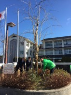 当日は、少し肌寒かったですが、天気もよく、風もない中で、シンボルツリ-に、6年生の児童の皆さんと一緒に土かけをしていただきました。そのほかに、校内にはヒラドツツジ54本も植えられました。