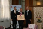1月31日(水)に、県知事室において、今年度の緑化功労者「シャクナゲ賞」の江竜喜之様(米原市)に三日月知事から表彰状(ヒノキ木製)が、また当会の山田理事長から記章が手渡されました。