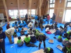 2月18日(土)、高取山ふれあい公園(多賀町)において、「緑の少年団活動交流会」を開催しました。県内から4団、42名の団員が参加してくれました。当日は残雪の中、午前中、滋賀森林インストラクター会の皆さんの指導による公園内の自然観察、公園職員さんからの炭窯、木質ペレット製造現場等の案内、午後は各団からこの1年間の活動報告を発表後、木片や自然枝木を利用してのネイチャークラフトづくりに生き生きした表情で取り組んでいました。