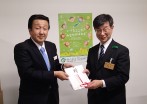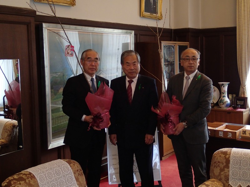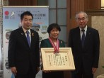 2月15日(水)、県知事室において、今年度緑化功労者「シャクナゲ賞」の川橋袖子様(近江八幡市)に三日月知事から表彰状(ヒノキ木製)が、また当会の山田理事長から記章が手渡されました。