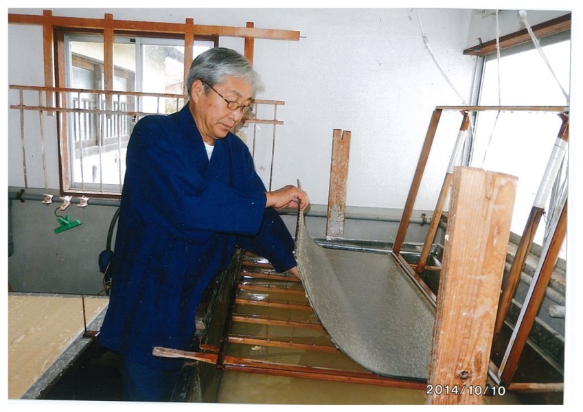 写真上:認定証の伝達授与状況、写真下:紙すき作業状況