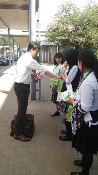 滋賀短期大学附属高校生による「緑の募金」街頭啓発活動がJR大津駅前で行われました。
