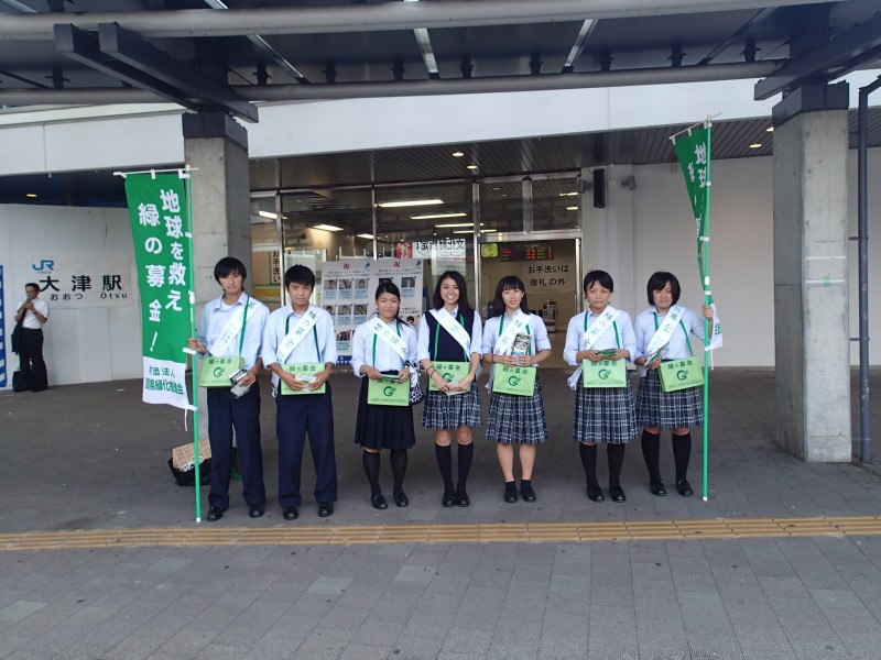 平成28年9月7日(水)午後、JR大津駅前において、滋賀短期大学付属高校生7名による「緑の募金」街頭啓発活動が行われました。1時間程度の時間でしたが、はつらつとした生徒の皆さんの呼びかけに、通行人の方から足を止めて募金をしていただき、緑化推進の啓発が図ることができました。