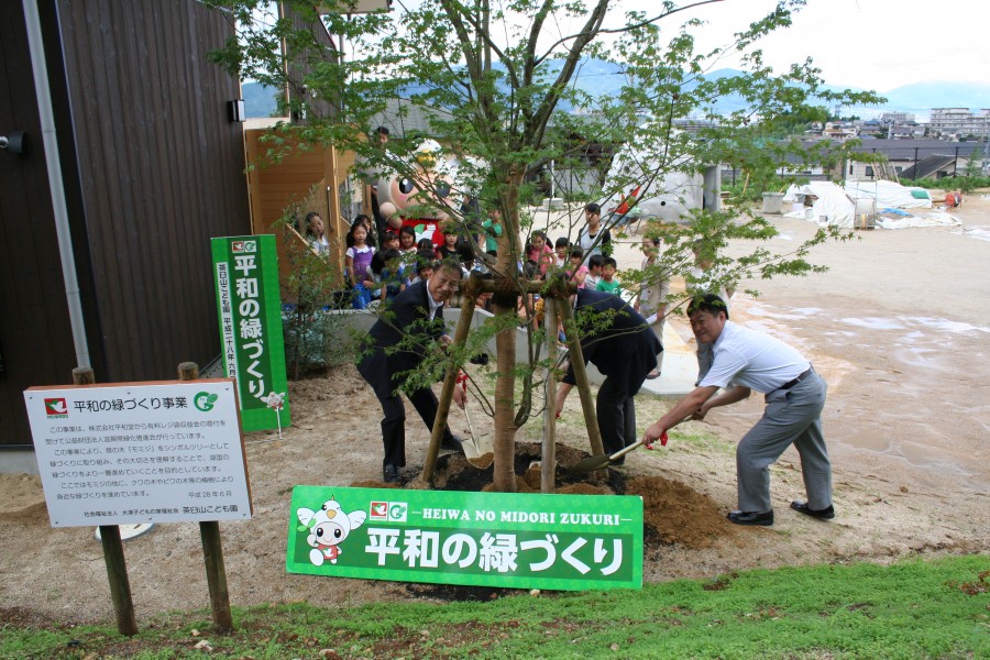 6月23日(木)に、比良山系と琵琶湖が展望できる恵まれた環境にある茶臼山こども園(大津市)において、(株)平和堂様からご寄付いただいた有料レジ袋収益金で進めている「平和の緑づくり事業」の記念植樹式を開催しました。今年度、1カ所目です。