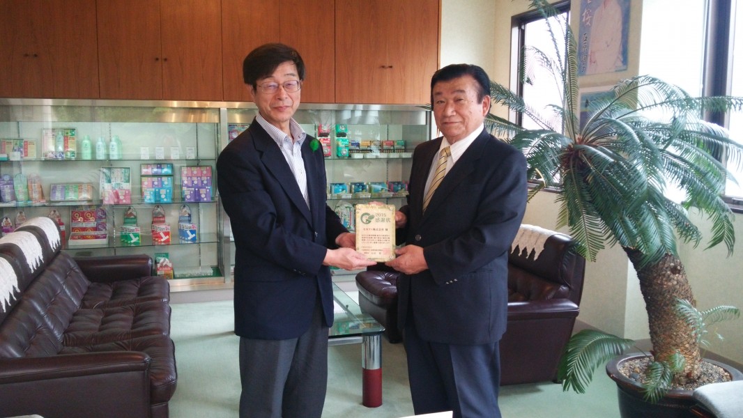 平成27年度「緑の募金・緑化推進」に多大なご協力をいただいたセネファ(株)様、MAU(株)様、ダイドードリンコ(株)様に感謝状(楯)を贈呈させていただきました。ありがとうございました。写真は上からセネファ(株)様(押谷代表取締役社長)、MAU(株)様(松井代表)、ダイドードリンコ(株)様(東口営業開発担当)