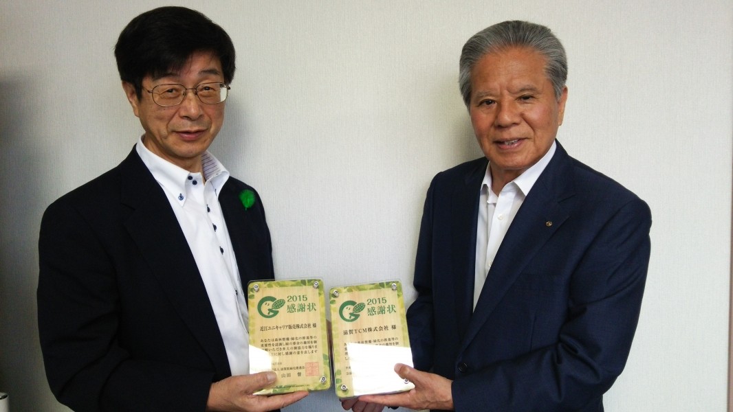 平成27年度「緑の募金・緑化推進」に多大なご協力をいただいた近江ユニキャリア販売(株)様、滋賀TCM(株)様と(株)平和堂様に感謝状(楯)を贈呈させていただきました。ありがとうございました。写真は上から近江ユニキャリア販売(株)様・滋賀TCM(株)様(木村隆司代表取締役社長)、(株)平和堂様(鷦鷯CSR推進室長)