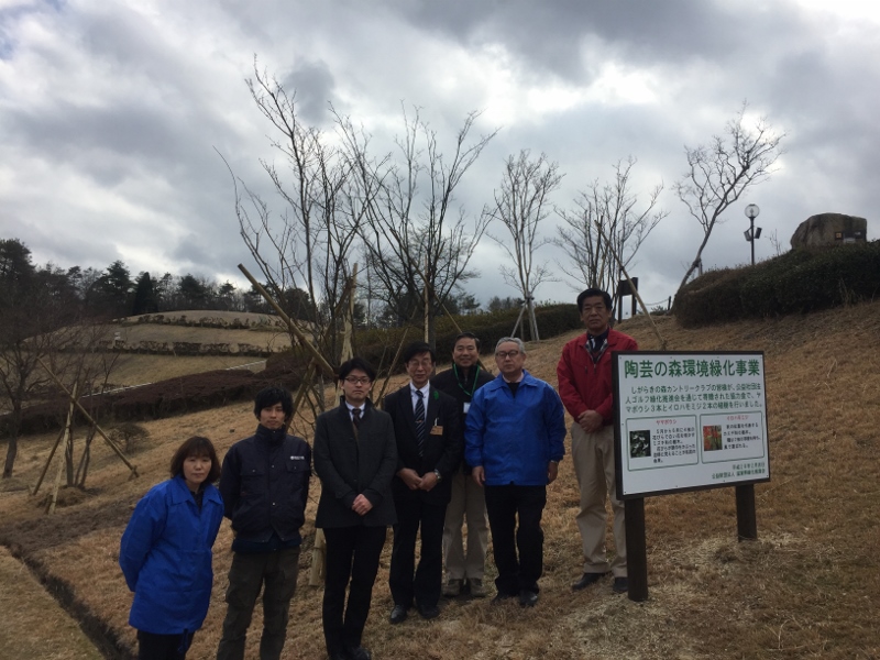 2月24日(水)、県立陶芸の森(甲賀市)においてゴルフ緑化協力金事業記念植樹式を開催しました。この事業はゴルファーの皆様方からいただいた緑化協力金を(公社)ゴルフ緑化促進会を通じて、社会公共施設の緑化推進を図るものであります。本県では平成23年度からしがらきの森カントリークラブ様の協力を得て、公共施設に植樹をしております。