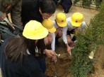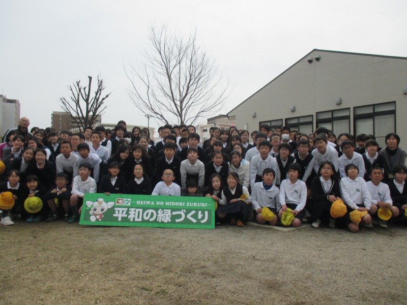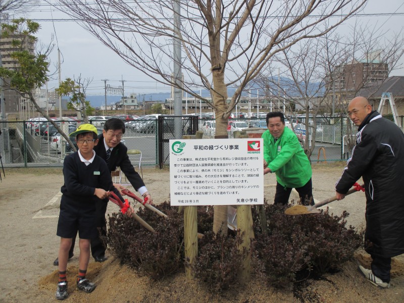 3月10日(木)に、矢倉小学校(草津市)において(株)平和堂様からご寄付いただいた有料レジ袋収益金で進めている「平和の緑づくり事業」の記念植樹式を平成27年度卒業記念植樹式も兼ねて開催しました。今年度〆の10箇所目です。当日は少し肌寒い天気でしたが、雨も上がった中で、植樹式では県の木「モミジ」の植樹とともに、春の新芽が黄金色になるキンメツゲ46本に今年度卒業する6年生112名の皆さんが「卒業してからまた見に来たいね」と言いながら土かけをしてくれました。思い出に残る卒業記念になりました