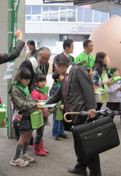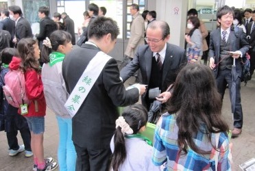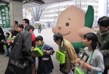 初日の4月1日にJR大津駅前をはじめ、県内9カ所で緑の少年団、ボーイスカウト、ガールスカウトをはじめ、各種団体、企業等の148名の皆さんの協力のもとで、街頭募金活動をさせていただき、多くの通勤の方々から募金していただきました。特に今年度は緑の募金のイメージキャラクターのドングリくんも一役買いました。ありがとうございました。今後も5月31日まで県内のJR駅前等で街頭募金活動をさせていただきますので、ご協力のほどよろしくお願いします。