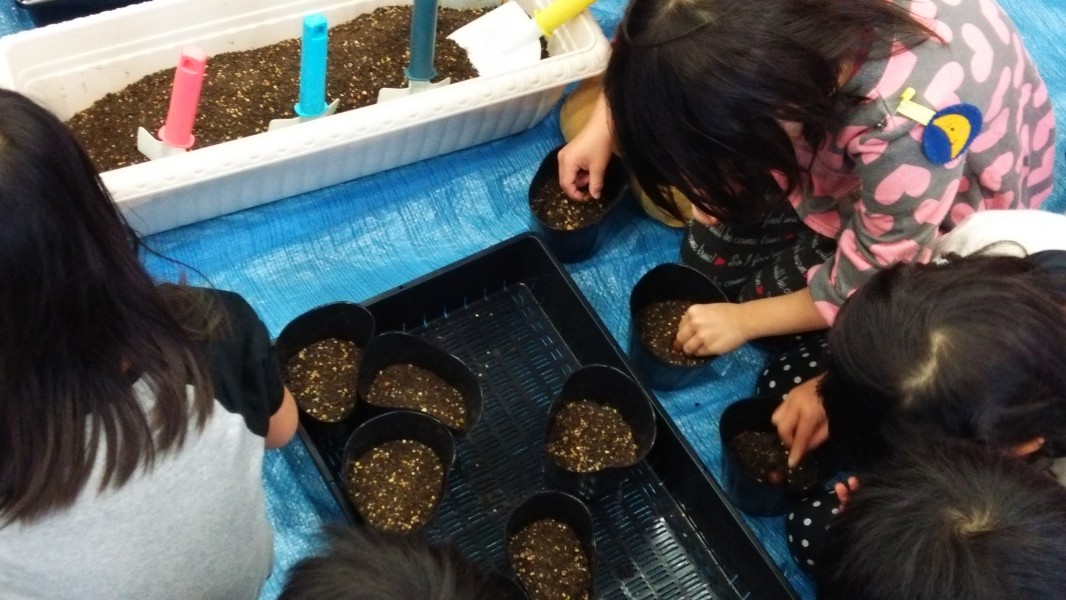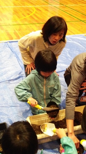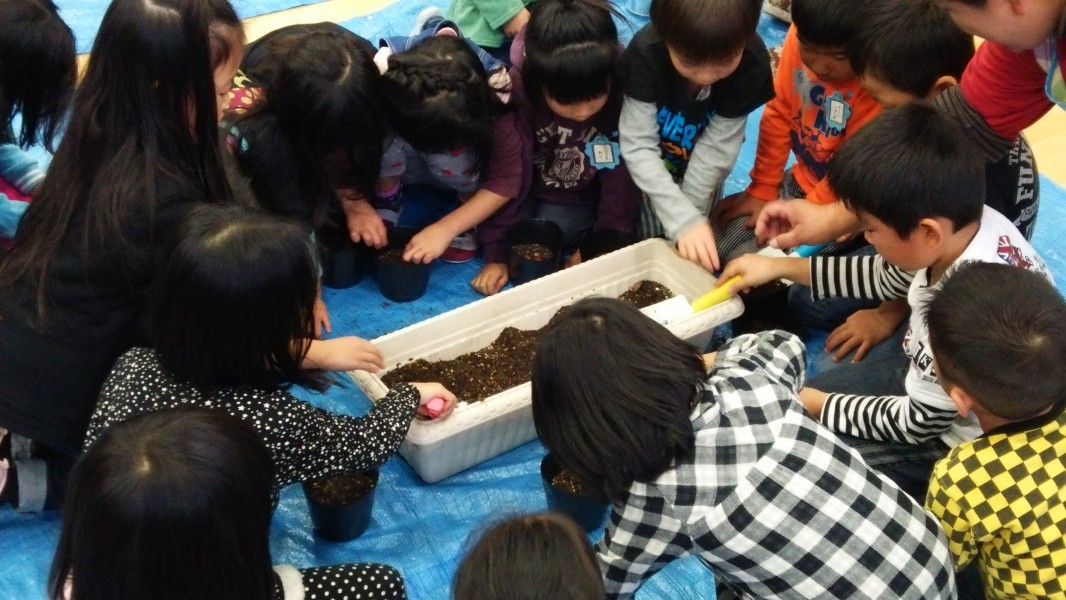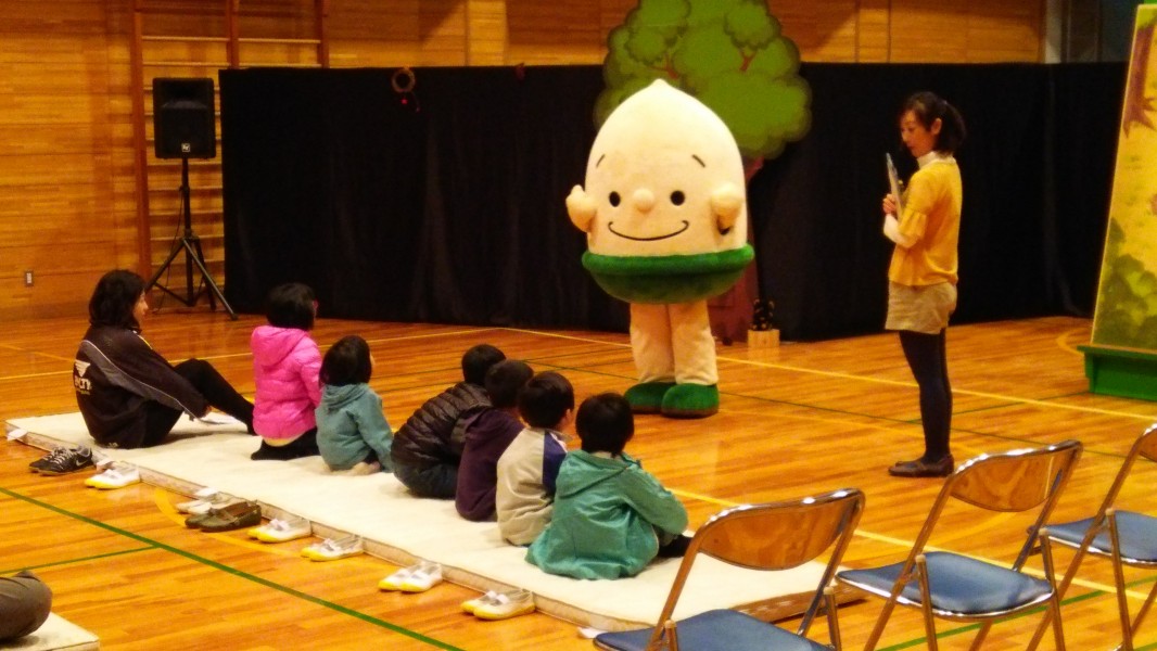 当日は212名の保育園児の皆さんが森のお話、どんぐりくんと森の仲間たちの演劇、森の体操と次々に繰り広げられる演出に、わくわくどきどきしながら、楽しんでもらいました。そして、どんぐり(クヌギ・コナラ)の種植えを小さな可愛い手でしてもらいました。3年後にどのような苗木になっているのか楽しみです。