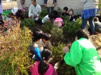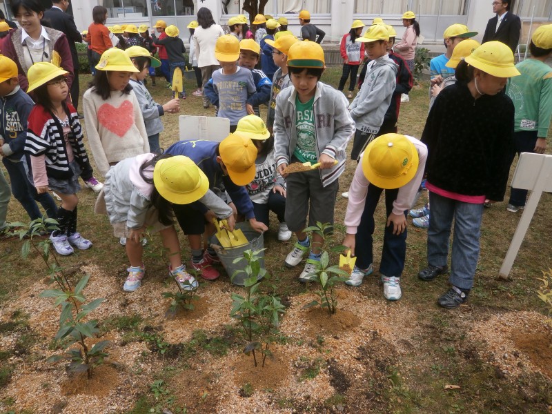 植樹式では、県の木「モミジ」の植樹とともに、当小学校3年生(86人)の皆さんの手で、実をつける木(センリョウ、、マンリョウ、ナンテン等)、沈丁花やシャクナゲ等9種類の苗木を植樹してもらいました。
