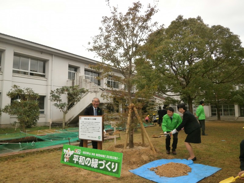 11月5日に今年開校30周年の希望ヶ丘小学校(甲賀市)で(株)平和堂様からご寄付いただいた有料レジ袋収益金で進めている「平和の緑づくり事業」の記念植樹式を開催。今回で4カ所目です。