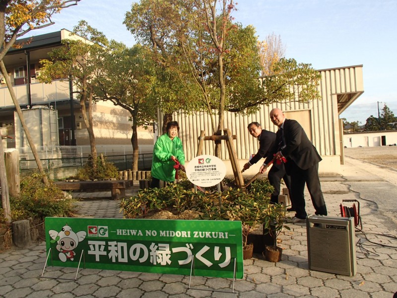 11月10日(月)に中央中学校(彦根市)において、(株)平和堂様からご寄付いただいた有料レジ袋収益金で進めている「平和の緑づくり事業」の記念植樹式を開催。今回で5カ所目です。