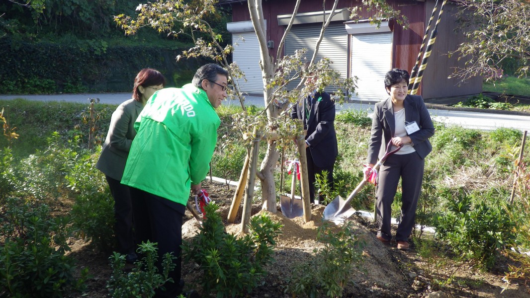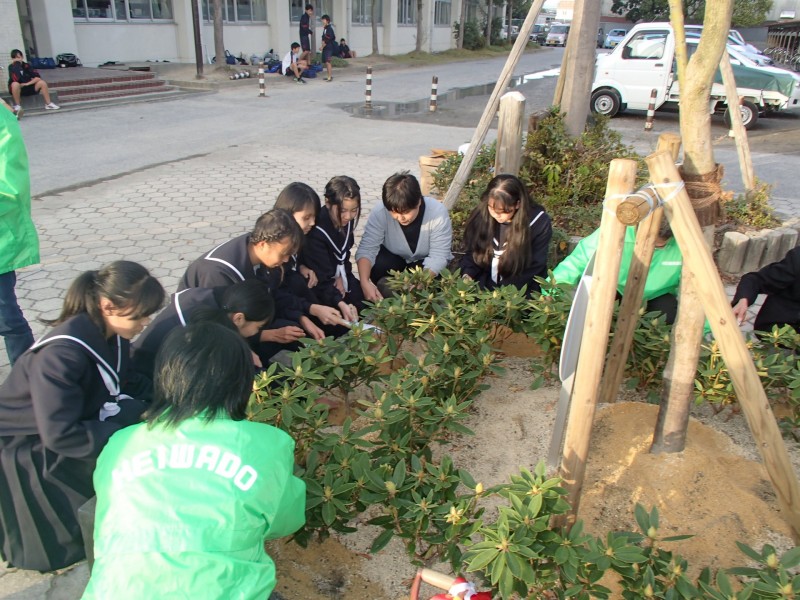 植樹式では、県の木「モミジ」の植樹とともに、当中学校生徒会の皆さんの手で、シャクナゲ(40本)を植樹してもらいました。校庭の花壇に植えられたシンボルツリーのモミジとシャクナゲが生徒の皆さんの心のオアシスとなることを期待しています。
