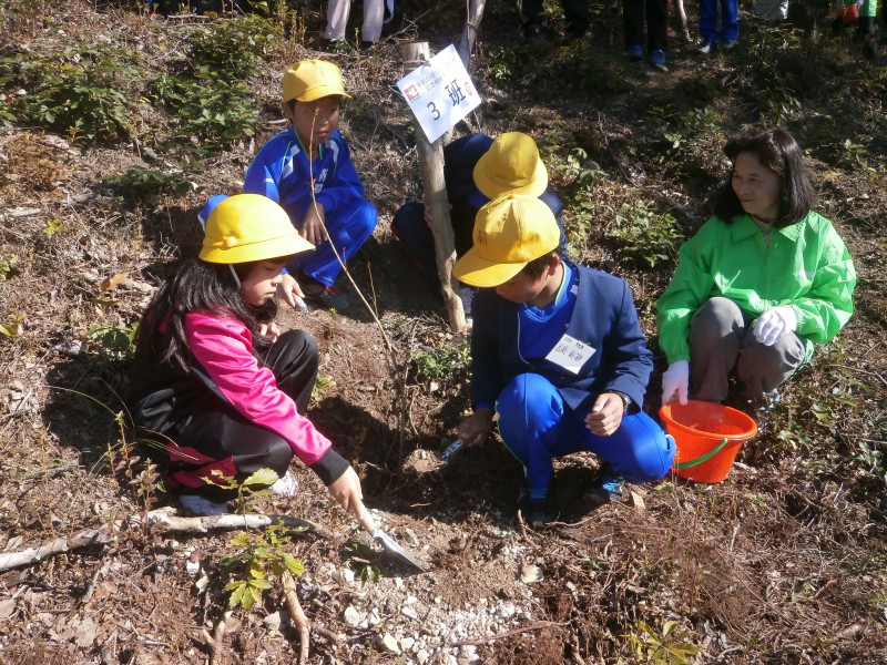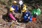 植樹式では、県の木「モミジ」の植樹とともに、多賀町の多賀、大滝両小学校の4年生(60人)の皆さんの手でシキザクラの苗木を植樹してもらいました。シキザクラの苗木が大きく育ち、きれいな花を咲かすのが楽しみです。