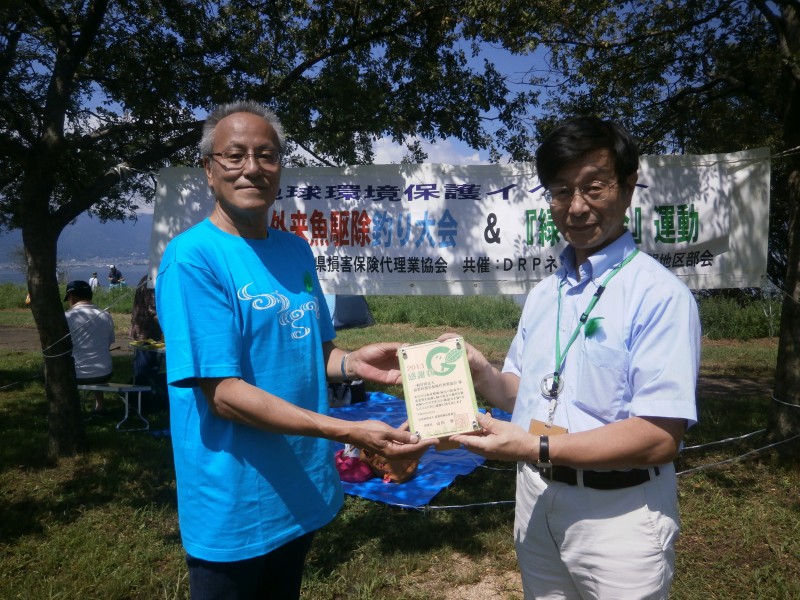 平成25年度「緑の募金」に多大なご協力をいただいた一般社団法人滋賀県損害保険代理業協会様に9月7日(日)、同協会主催の「外来魚釣り大会」の場で感謝状(楯)の贈呈をしました。当日も参加者の皆様から多くの募金をしていただきました。ありがとうございました。